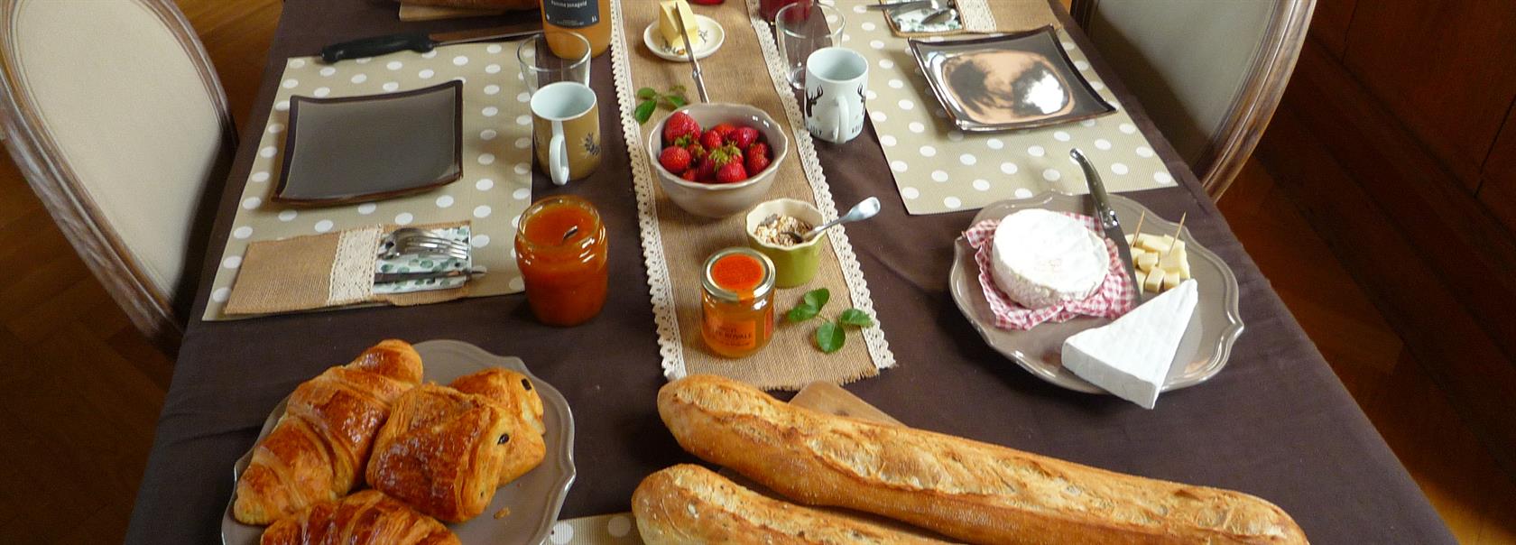 Le petit déjeuner comprend : croissants, pains au chocolat, baguette tradition, miel, confiture maison, beurre, jus de pomme de la région, fruit de saison.